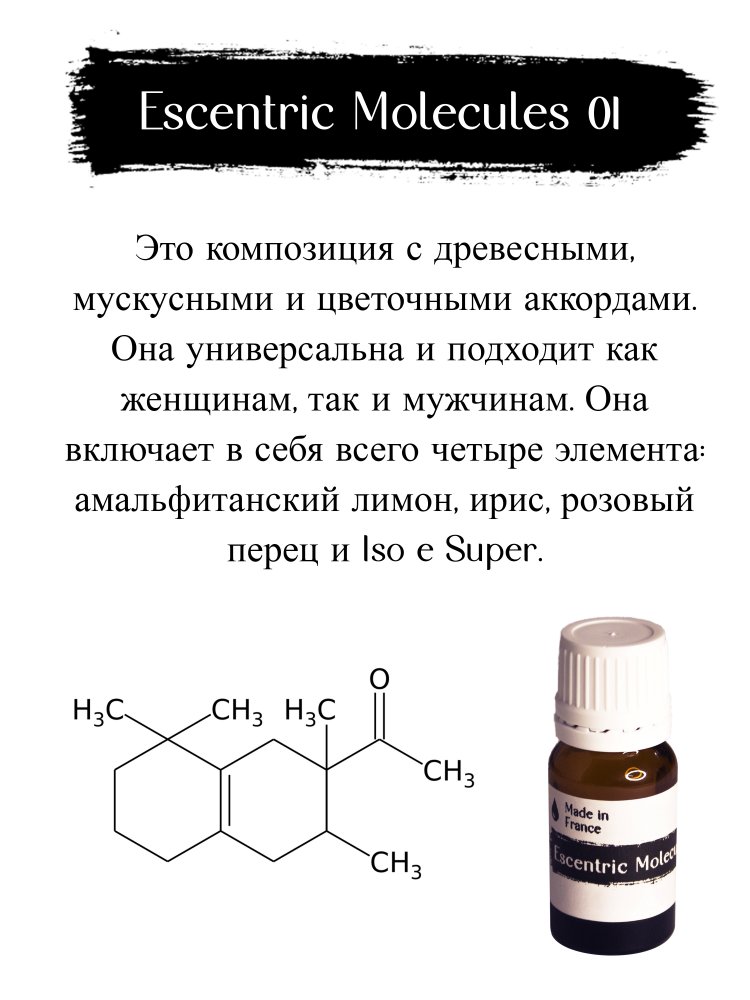 Это композиция с древесными, мускусными и цветочными аккордами. Она универсальна и подходит как женщинам, так и мужчинам. Она включает в себя всего четыре элемента: амальфитанский лимон, ирис, розовый перец и Iso e Super.