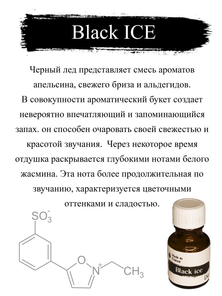 Черный лед представляет смесь ароматов апельсина, свежего бриза и альдегидов. В совокупности ароматический букет создает невероятно впечатляющий и запоминающийся запах. он способен очаровать своей свежестью и красотой звучания. Через некоторое время отдушка раскрывается глубокими нотами белого жасмина. Эта нота более продолжительная по звучанию, характеризуется цветочными оттенками и сладостью.