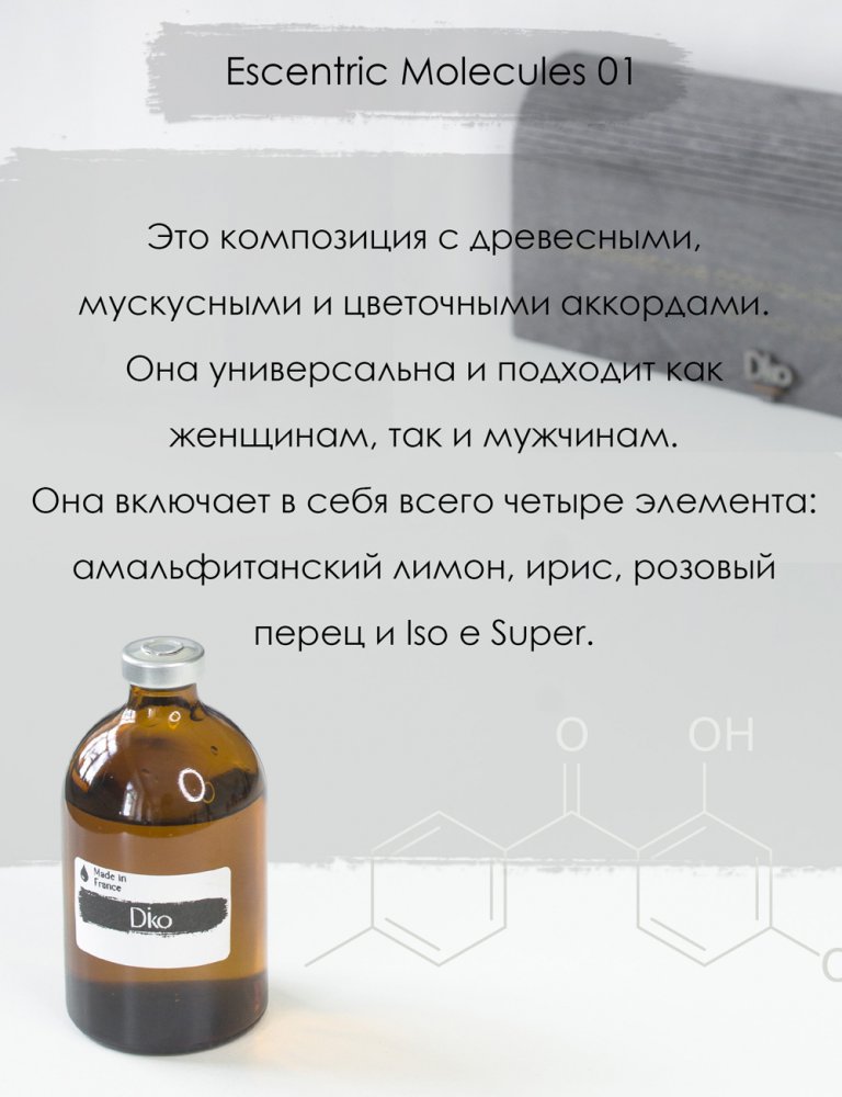 Рефил / наполнитель Escentric Molecules Molecule 01 - это композиция с древесными, мускусными и цветочными аккордами. Она универсальна и подходит как женщинам, так и мужчинам. Она включает в себя всего четыре элемента: амальфитанский лимон, ирис, розовый перец и Iso e Super.