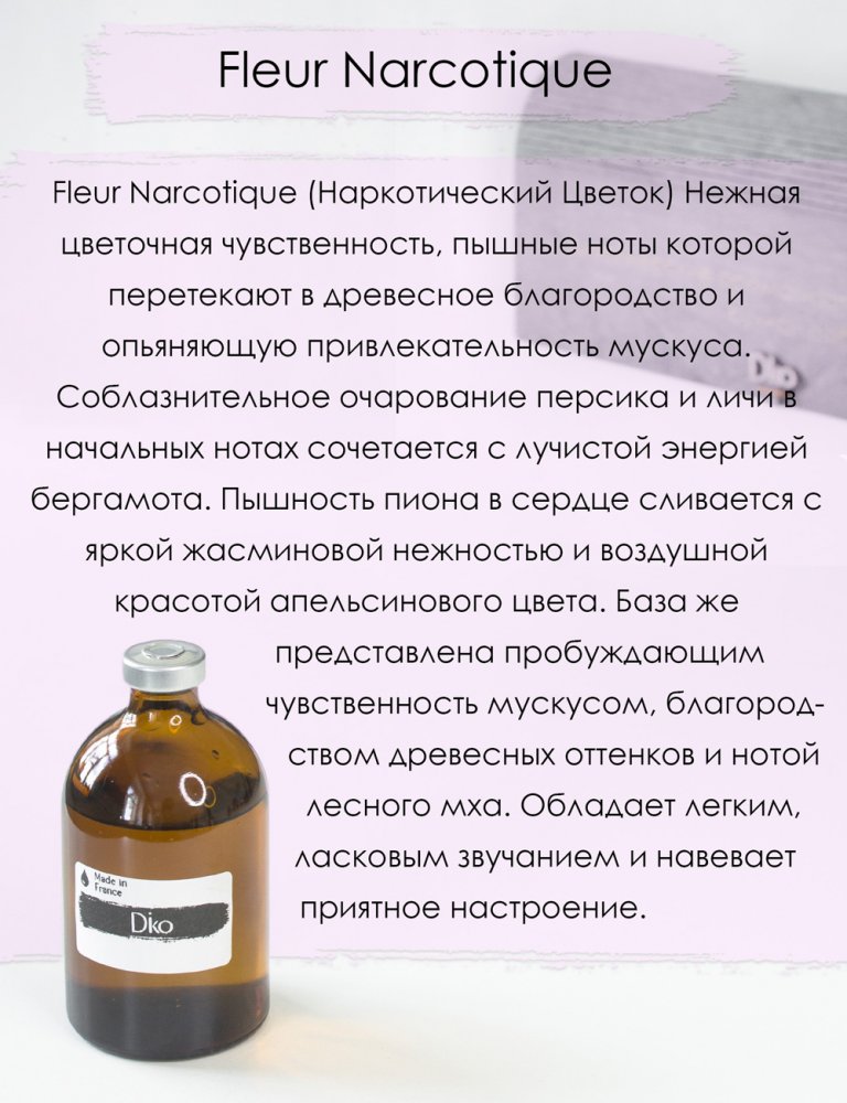 Рефил / наполнитель с ароматом Наркотический Цветок - Нежная цветочная чувственность, пышные ноты которой перетекают в древесное благородство и опьяняющую привлекательность мускуса. Соблазнительное очарование персика и личи в начальных нотах сочетается с лучистой энергией бергамота. Пышность пиона в сердце сливается с яркой жасминовой нежностью и воздушной красотой апельсинового цвета. База же представлена пробуждающим чувственность мускусом, благородством древесных оттенков и нотой лесного мха. Обладает легким, ласковым звучанием и навевает приятное настроение.