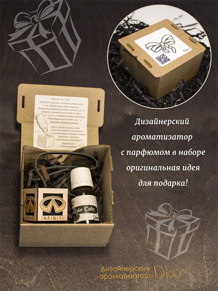 Французский автопарфюм в салоне Infiniti в дизайнерском исполнении от Diko. Автоароматизатор позволит долго наслаждаться приятным, дорогим ароматом и внешней эстетикой в салоне автомобиля. Стильный, минималистичный дизайн и легендарный запах парфюмерного масла дарят истинное ощущение роскоши. Ароматизатор для автомобиля Инфинити - это парфюм для салона ручной работы с искусной детализацией. Пахучка подвеска в авто из эко материалов в деревянном корпусе, внутри щепа бука, снаружи фетр и 100% кожа, это сочетание материалов полностью раскрывает аромат. Арома-подвеска на шнурке регулируется по высоте. Ароматизатор в машину Infiniti многократно превосходит пластиковые, стеклянные аромадиффузоры и другие аналоги. Ароматизатор в авто унисекс одинаково понравится мужчине водителю и автоледи. Многоразовый авто ароматизатор Infiniti - безупречный подарок для автолюбителя. Дарить такое приятно, а получать - вдвойне! Подарочная упаковка приумножит эмоции от презента.