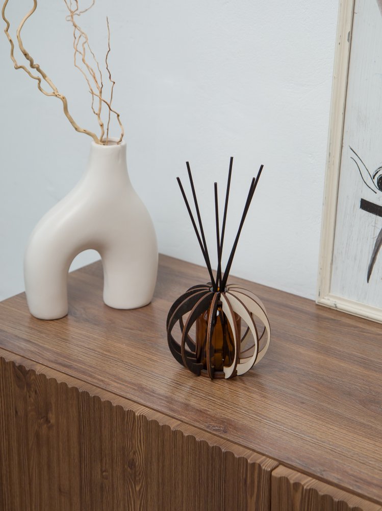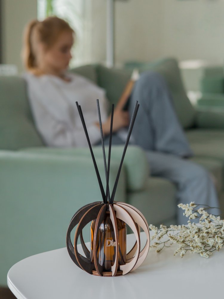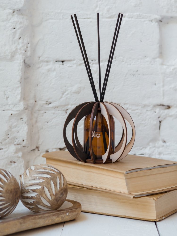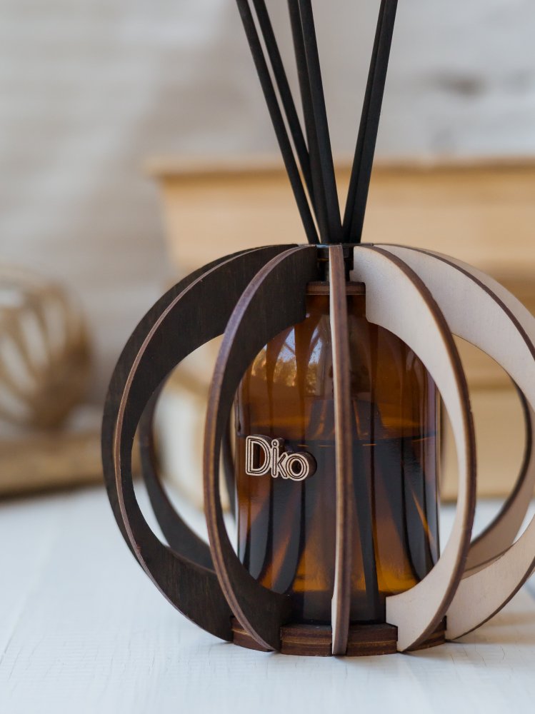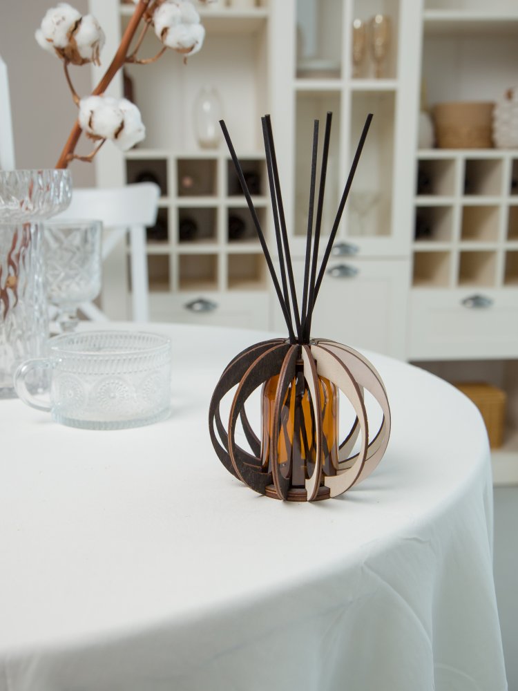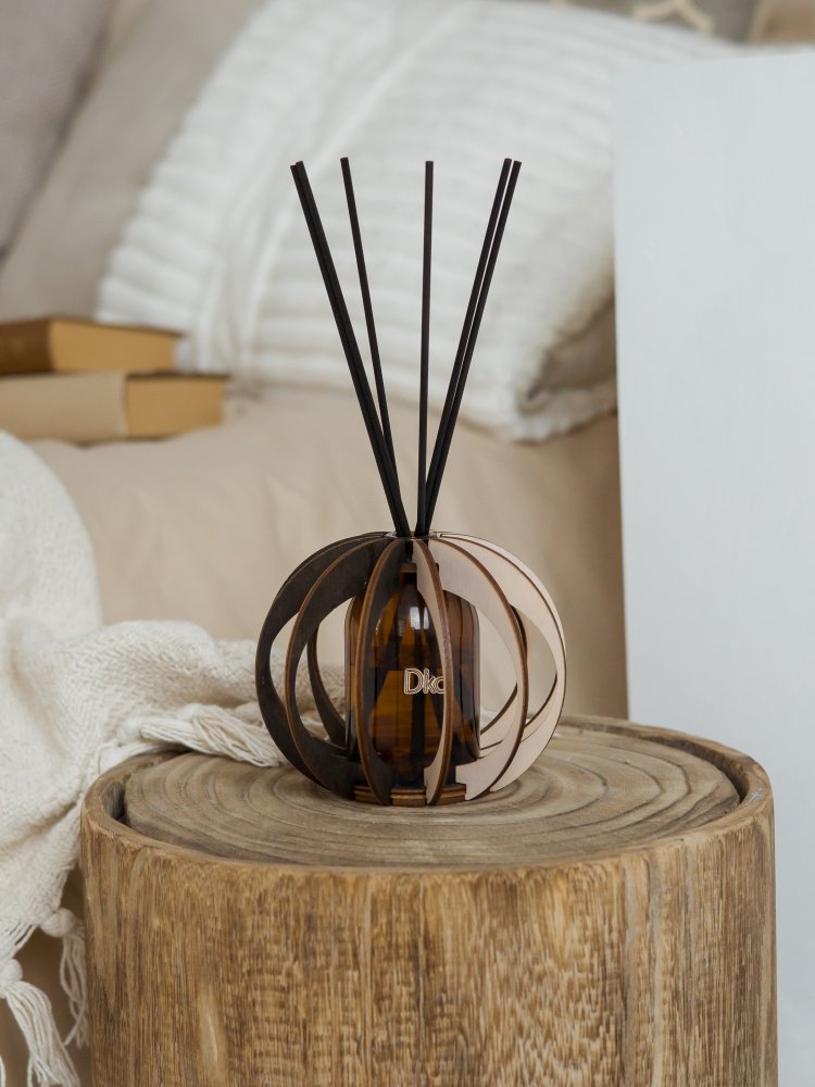 Уникальный дизайн аромадиффузора станет отличным дополнением и украшением для любого интерьера. Арома диффузор изготовлен только из высококачественных натуральных материалов . Емкость для парфюма 100 мл выполнена из стекла, а декоративное оформление из дерева лиственных парод. Все комплектующие собраны вручную. (Жидкость и фибровые палочки в комплект не входят.)